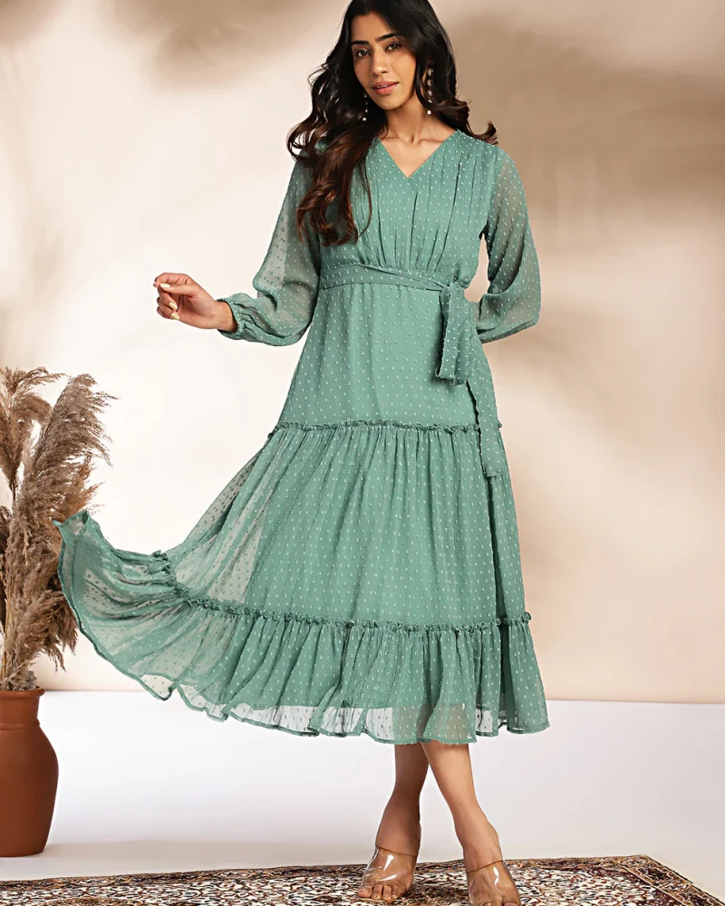 Elegant sage green tiered dress crafted in dobby chiffon fabric. Features a flowy silhouette with soft gathers, making it perfect for casual outings, brunch, and day wear.