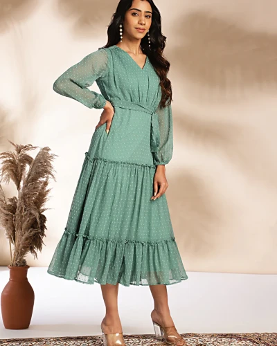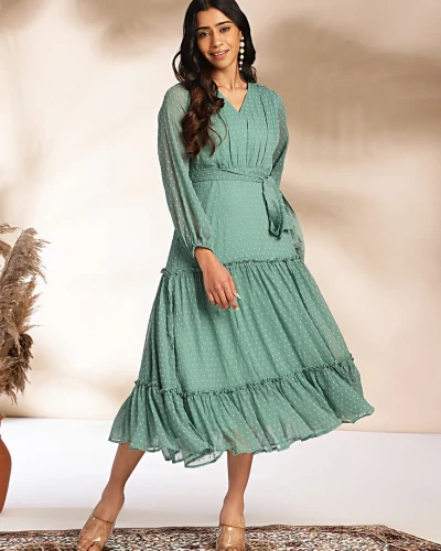 Sage Dobby Chiffon Solid Tiered Dress